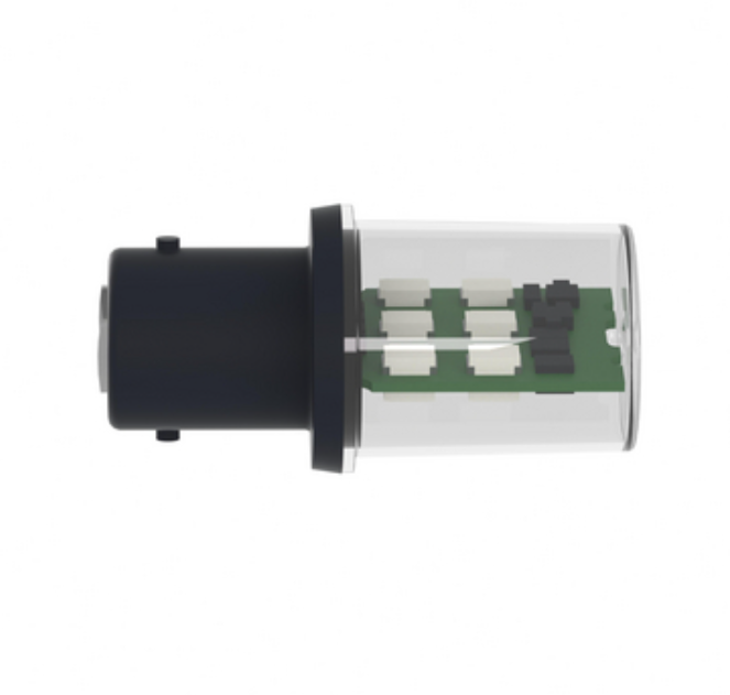 Brand Steady-On LEDs, Red Color PROTECTED LED® is an integrated light module offering special control and protection circuits, which negate the effects of electrostatic discharge, capacitive coupling and electromagnetic radiation. In addition, these protective circuits inhibit LED illumination due to proximity switch or PLC I/O module leakage currents. The protection device prevents spurious LED illumination by absorbing any interference, such as the energy resulting from coil de-energization.-BA 15d Base Lamp Is Actually a Vertical PCB Incorporating 8 to 12 LEDs -Overvoltage and Reverse Polarity Protection -Flashing LEDs for Use with XVP Lens Units Only